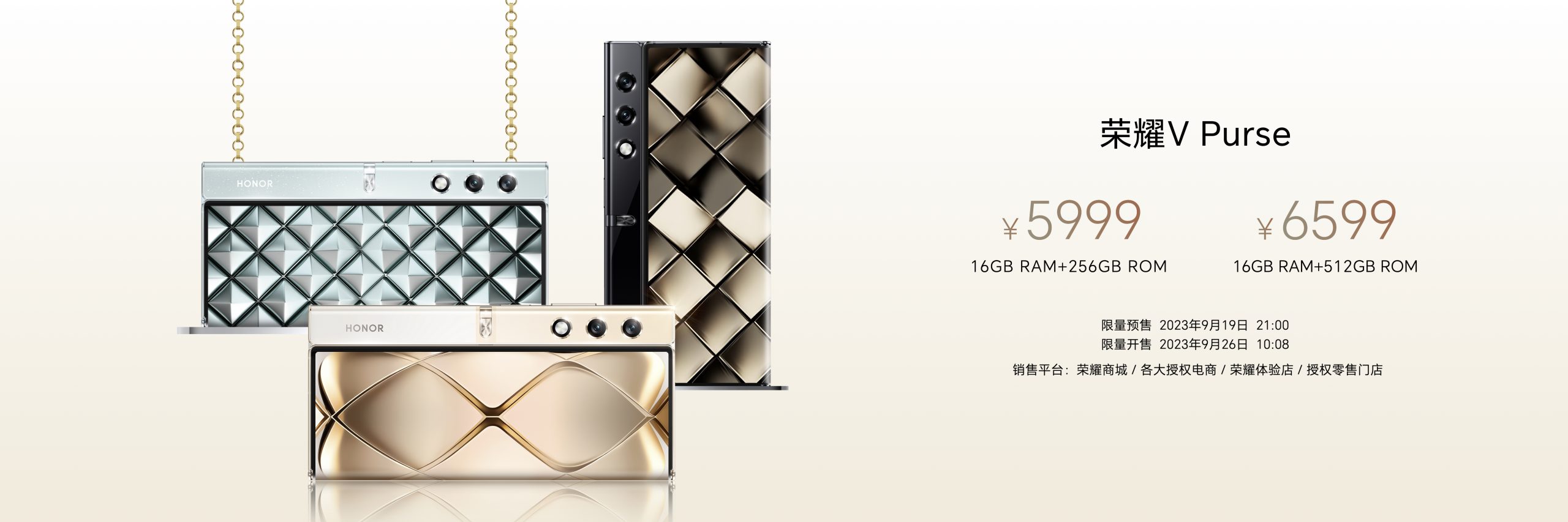 榮耀V Purse融合了輕薄折疊機(jī)身、百變玩法的時尚錢包形態(tài)、超自由寫真相機(jī)、2K超清護(hù)眼大屏于一身,超越了用戶對折疊屏的固有認(rèn)知,成為榮耀在折疊屏手機(jī)領(lǐng)域的全新探索。本次榮耀V Purse共提供三種配色:山茶金、冰川藍(lán)、雅黑色三款時尚配色,售價為5999元(16GB+256GB版本); 6599元(16GB+512GB版本),將于9月19日21:00在榮耀商城、各大授權(quán)電商、榮耀體驗店及授權(quán)零售門店開啟限量預(yù)售,9月26日10:08限量開售。