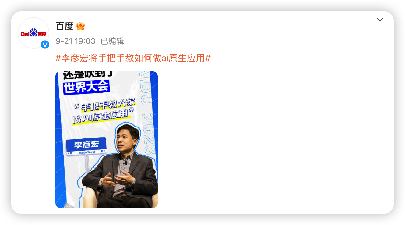 作為百度世界最重要的環(huán)節(jié),李彥宏公開表示將要演講中“手把手教你做AI原生應用”,這句話配得上“AI教父”的稱號,也對得起我們對百度世界的期待。
