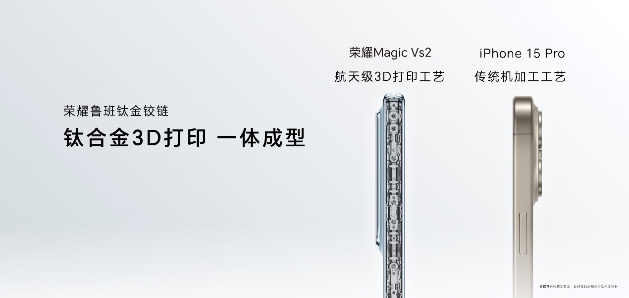 在折疊屏產品關鍵器件鉸鏈方面,榮耀Magic Vs2采用由鈦合金3D打印技術制成的榮耀魯班鈦金鉸鏈,帶來輕薄與堅固兼具的使用體驗。鉸鏈0齒輪結構和懸浮水滴結構的應用也讓榮耀Magic Vs2開合順滑,且支持多角度自由懸停。在輕量化更進一步的同時,榮耀Magic Vs2也做到了5.1mm的展開態厚度、10.7mm的折疊態厚度,在同類折疊屏手機當中繼續保持領先水平。