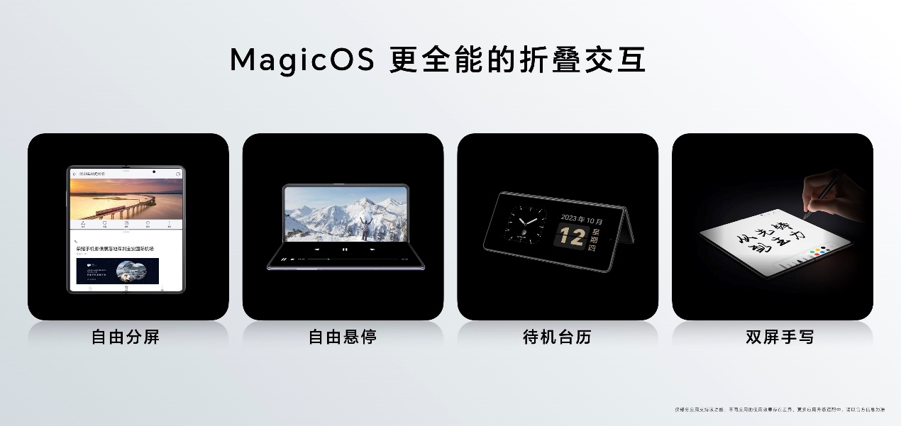 榮耀Magic Vs2支持多種分屏、應用掛起方式,在分屏操作上更是帶來精簡高效的“一步分屏”操作,進一步解鎖大屏生產力。榮耀Magic Vs2的懸停玩法也進一步豐富,在包括待機、觀影、會議、音樂、拍攝、辦公等多種應用場景下,都能釋放雙手進行使用,盡享折疊屏專屬體驗。