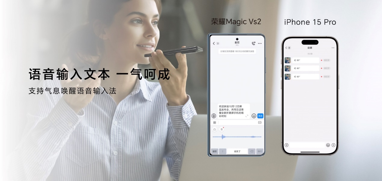 YOYO建議的智慧出行新增“機場大屏卡片”,用戶可在手中隨時看到航班進港/出港動態信息輪播,行程盡在掌握。氣息喚醒功能也得到了全新升級。在需要輸入文字的場景下,榮耀Magic Vs2可實現氣息喚醒語音輸入法,語音內容直接轉為文字進行輸入,溝通效率進一步提升。同時,榮耀Magic Vs2根據實際使用場景,帶來更加智慧的掃碼體驗,翻腕即可完成掃碼動作。