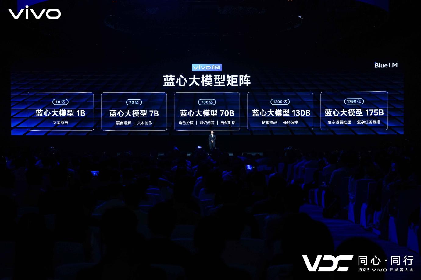 主會(huì)場(chǎng)上,vivo副總裁、OS產(chǎn)品副總裁周圍發(fā)布了“1+2+N”的智能系統(tǒng)體驗(yàn)。其中的1,即vivo自研通用大模型矩陣——藍(lán)心大模型BlueLM;2,即系統(tǒng)全局智能輔助應(yīng)用“藍(lán)心小V”和以公版APP形式推出的自然語言對(duì)話機(jī)器人“藍(lán)心千詢”;N,即開發(fā)者依托vivo業(yè)界首家開源的70億藍(lán)心大模型和對(duì)應(yīng)的微調(diào)框架以及大模型開發(fā)套件BlueKit打造的高效、低成本專屬大模型。1+2+N,將為用戶和開發(fā)者帶來行業(yè)領(lǐng)先的智能化體驗(yàn)。