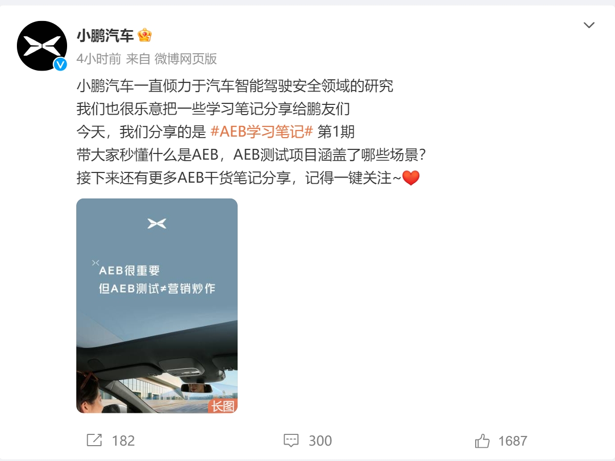 速途網(wǎng)訊 圍繞AEB的爭論仍未結(jié)束。今日,小鵬汽車發(fā)布微博向鵬友們普及AEB。速途網(wǎng)注意到,該微博顯示這僅僅是“AEB學(xué)習(xí)筆記”的第一期。