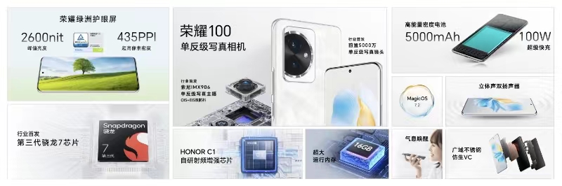 榮耀100搭載榮耀綠洲護眼屏,通過硬件級低藍光認證,搭配3840Hz超高頻PWM零風險調(diào)光、類自然光護眼與助眠顯示技術(shù),全天候呵護用眼健康。影像方面,榮耀100首發(fā)索尼IMX906單反級寫真主攝、112°超廣角微距鏡頭、前置5000萬像素單反級寫真鏡頭,為用戶提供強大的影像體驗。性能方面,首次搭載第三代驍龍7芯片和自研射頻增強芯片C1,時刻滿分在線。搭配5000mAh大電池以及100W超級快充,為用戶帶來持久續(xù)航的產(chǎn)品體驗。