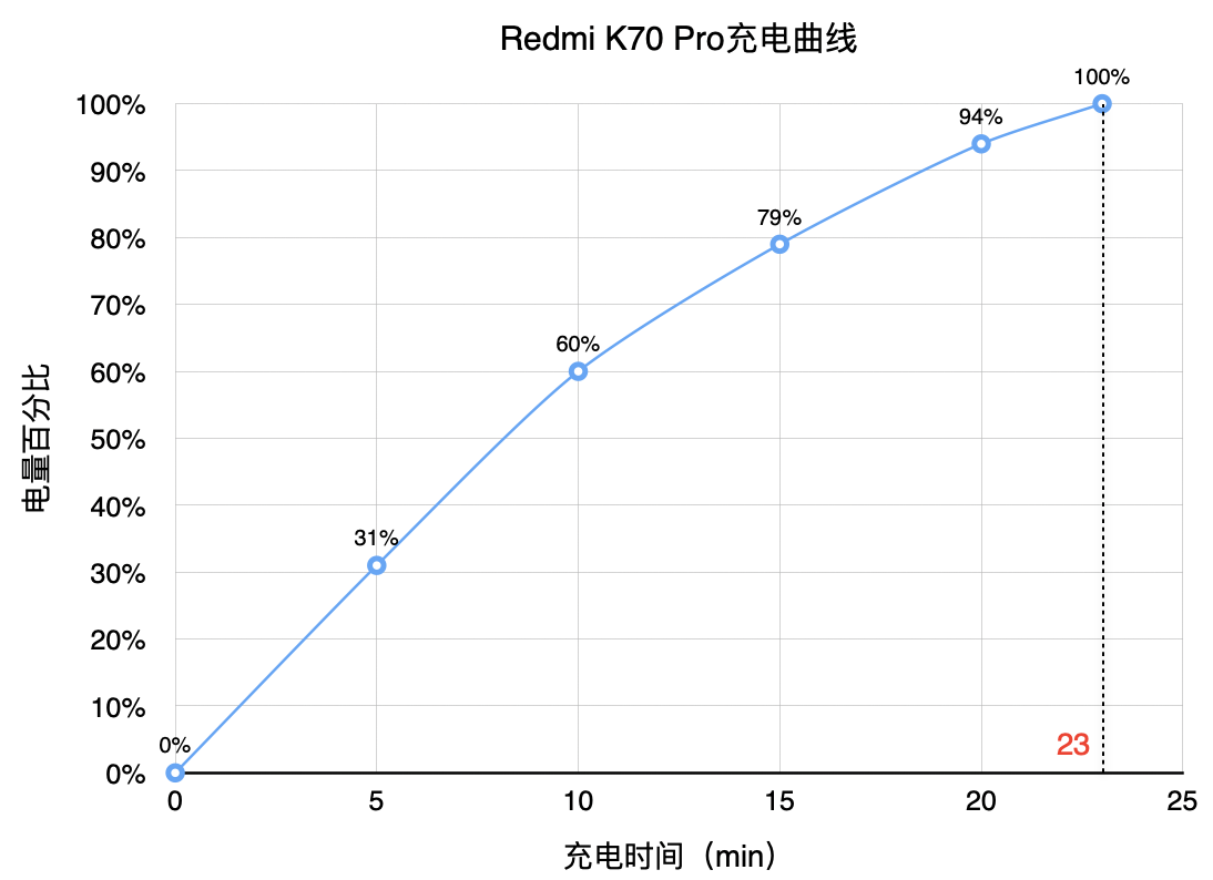 為了保證充足的續航,Redmi K70 Pro搭載5000mAh超大容量電池,并基于小米自研的澎湃電池管理系統,同時支持120W的有線快充。實測使用原裝充電器為K70 Pro充電,0-100%僅需耗時23分鐘。