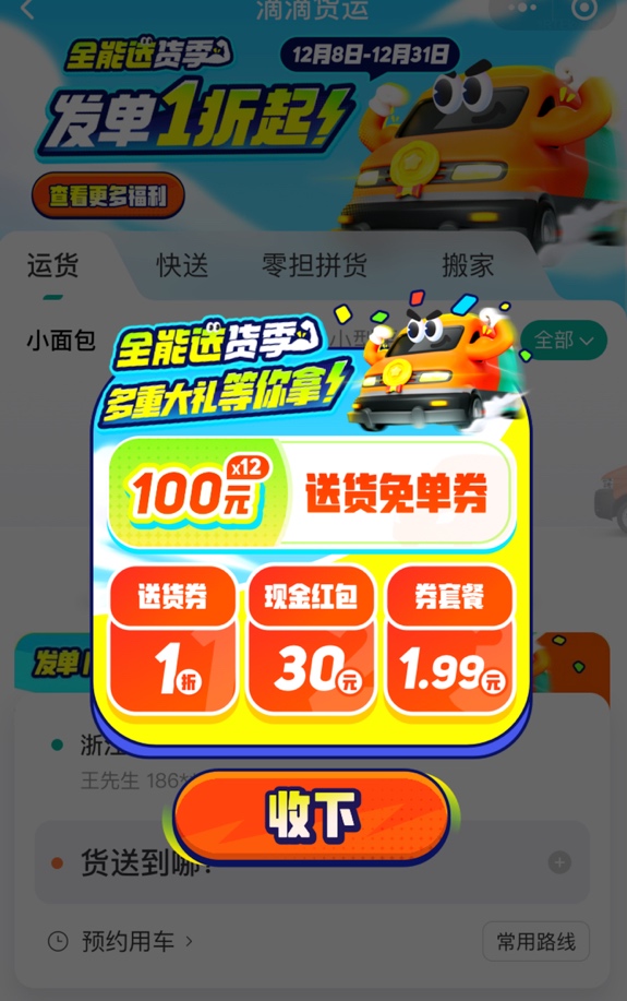 (配圖:滴滴貨運全能送貨季用戶活動彈窗)