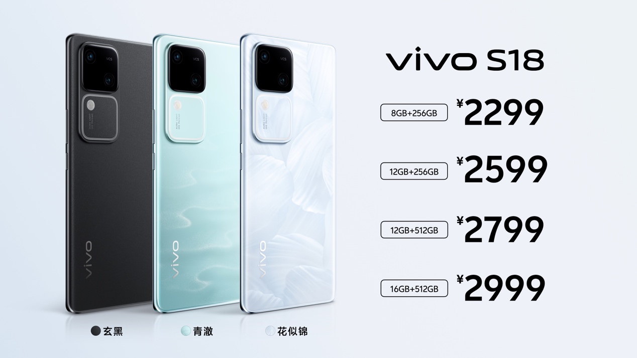 vivo S18系列有花似錦、青澈、玄黑三種配色。其中,vivo S18 8GB+256GB版售價2299元,12GB+256GB版售價2599元,12+512GB版售價2799元,16GB+512GB版售價2999元;vivo S18 Pro 12GB+256GB版售價3199元,16GB+256GB版售價3499元,16GB+512GB版售價3699元。