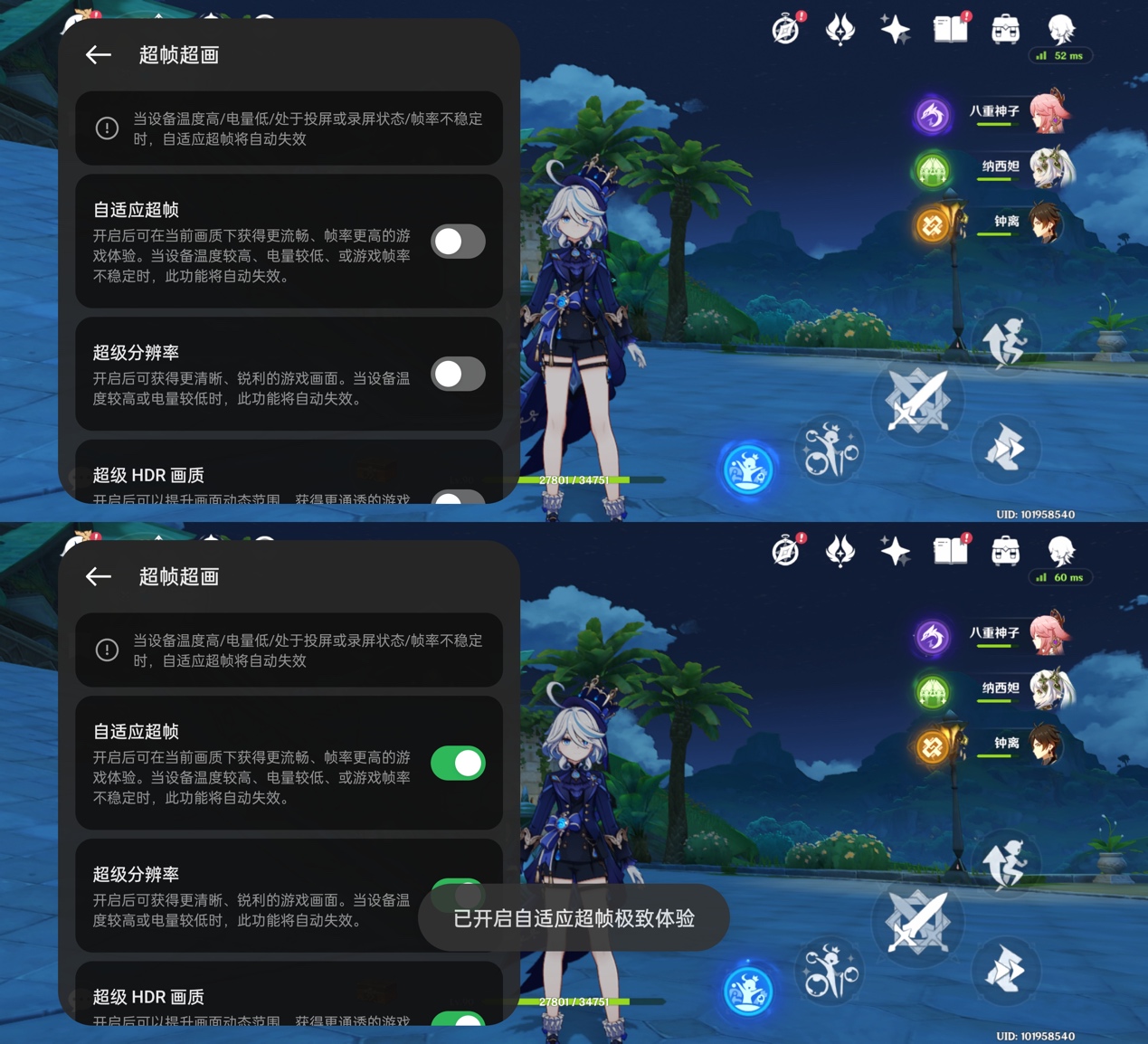 在一加Ace 3的游戲過程中,玩家可在游戲中心的超幀超畫功能,開啟自適應超幀、超級分辨率、超級HDR畫質這三個功能,無需額外適配,所有游戲都可以開啟。其中,自適應超幀可以將游戲渲染分辨率來到1.5K,超級分辨率則能突破游戲限制實現120 FPS。值得一提,一加Ace 3超級分辨率與自適應超幀兩個選項可以同時開啟,沒有任何限制。