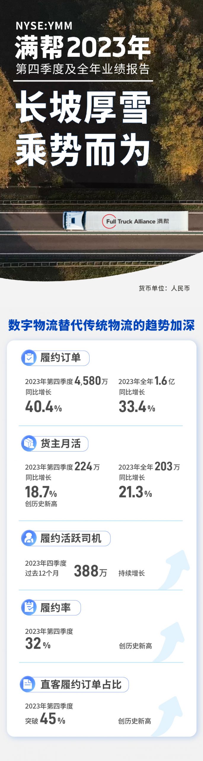 2023年第四季度,滿幫實現營業收入24.1億元(人民幣,下同),同比增長25.3%,非美國會計準則下實現凈利潤7.3億元,同比增長64.4%。