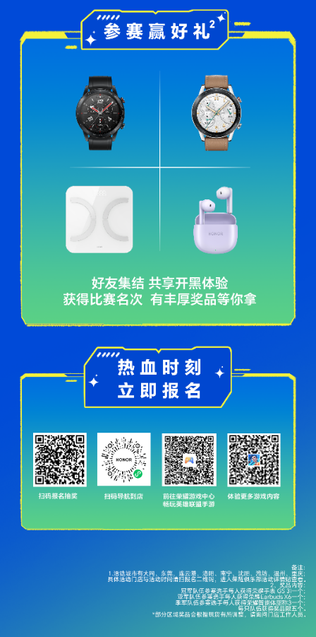 本次活動,榮耀設置了豐厚的賽事好禮:冠軍隊伍參賽選手每人可獲贈榮耀手表GS 3i;亞軍隊伍參賽選手每人可獲贈榮耀Earbuds?X6;季軍隊伍參賽選手每人可獲贈榮耀智能體脂稱3;每支隊伍獲得獎品限量五個。如果你也對此感興趣,快叫上你的小伙伴們一起掃碼報名,點燃熱血時刻!