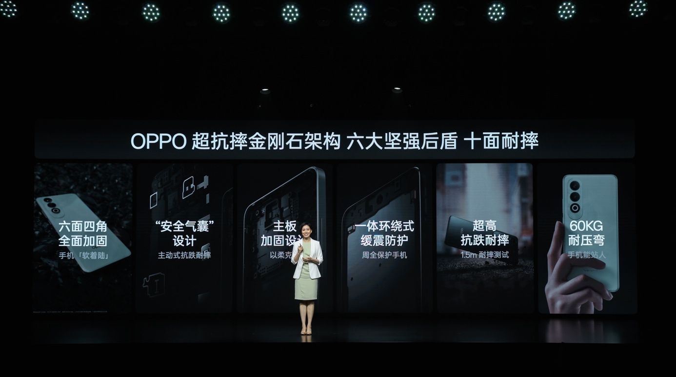在輕薄機身基礎上,OPPO K12在機身結構設計上也進行了全面升級,采用獨家自研的「超抗摔金剛石架構」,針對手機屏幕、背蓋、四角、四邊,OPPO K12都做了加固,實現十面耐摔。此外在手機攝像頭、芯片等關鍵部位,OPPO K12也采取了支撐保護,尤其是在主板上蓋和下蓋之間擁有支撐骨位,可以讓手機更耐摔更好的保護主板。除了耐摔,OPPO K12還通過了60kg極限彎折測試,強度相比于行業常規的40kg測重提升 50%,能夠更好地應對坐壓等情況。OPPO K12憑借嚴苛的極限測試標準,打造出了旗艦品質,以滿分成績榮獲「瑞士 SGS 金標五星整機抗跌耐摔認證」。