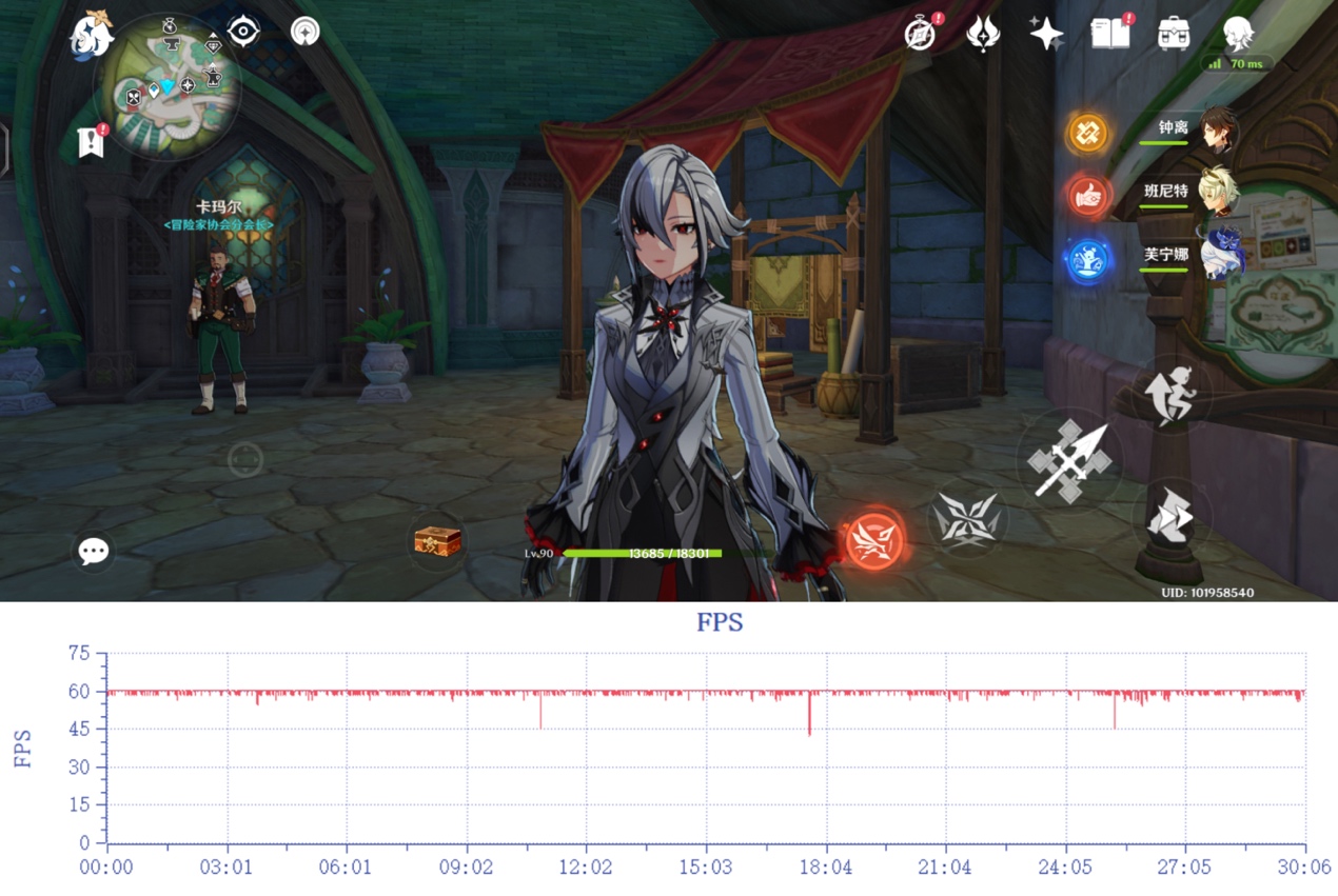 而在更高負(fù)載的《原神》測(cè)試環(huán)節(jié),先將游戲內(nèi)畫(huà)面設(shè)置調(diào)為“極高”,再手動(dòng)將幀率調(diào)整到60FPS的模式iQOO Z9 Turbo在30分鐘的游戲過(guò)程中,平均幀率維持在了57.83FPS,且?guī)嗜瘫憩F(xiàn)穩(wěn)定。