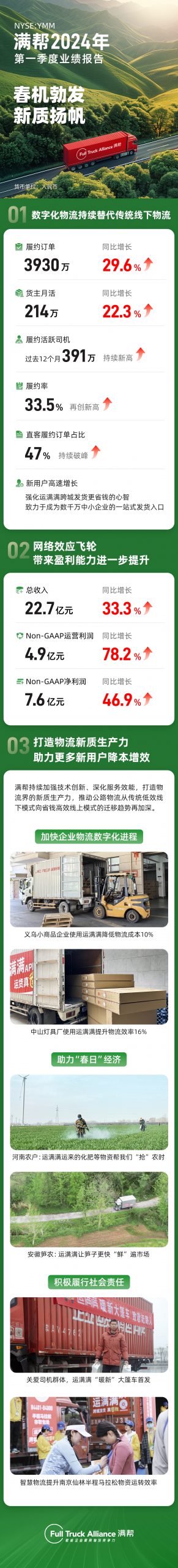 速途網(wǎng)5月22日消息(報(bào)道:李楠)昨日,數(shù)字貨運(yùn)平臺(tái)滿幫集團(tuán)(YMM.US)于美股盤(pán)前發(fā)布了2024年第一季度財(cái)報(bào)。數(shù)據(jù)顯示,滿幫本季度各項(xiàng)關(guān)鍵運(yùn)營(yíng)指標(biāo)獲得持續(xù)提升,履約率、直客履約訂單占比等數(shù)字再創(chuàng)歷史新高,平臺(tái)對(duì)于司機(jī)貨主雙端創(chuàng)造的價(jià)值得到進(jìn)一步驗(yàn)證。