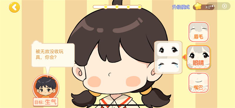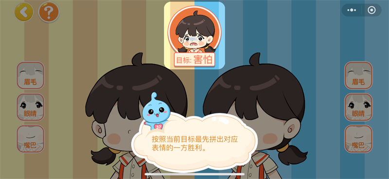 在五官認知版塊,兒童可以通過生動的動畫,識別和了解五官,為后續的訓練打下基礎;在有了比較準確的認知后,進行面部表情的訓練,讓兒童了解基礎的情感表達方式。在此基礎上,游戲增設情景模擬模塊,讓兒童模擬在各類場景下,如何適當地表達自己的情緒泛化訓練效果。