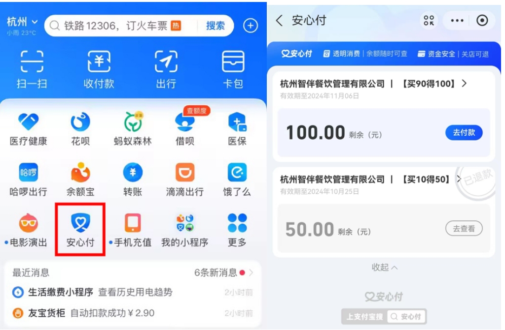 具體來說,在傳統預付式消費場景中,消費者可在商家處用支付寶掃“安心付”碼購卡,預付資金進入銀行專用賬戶,用戶消費一筆、賬戶扣款一筆,消費筆筆透明、記錄余額可查、商家關店可退款。