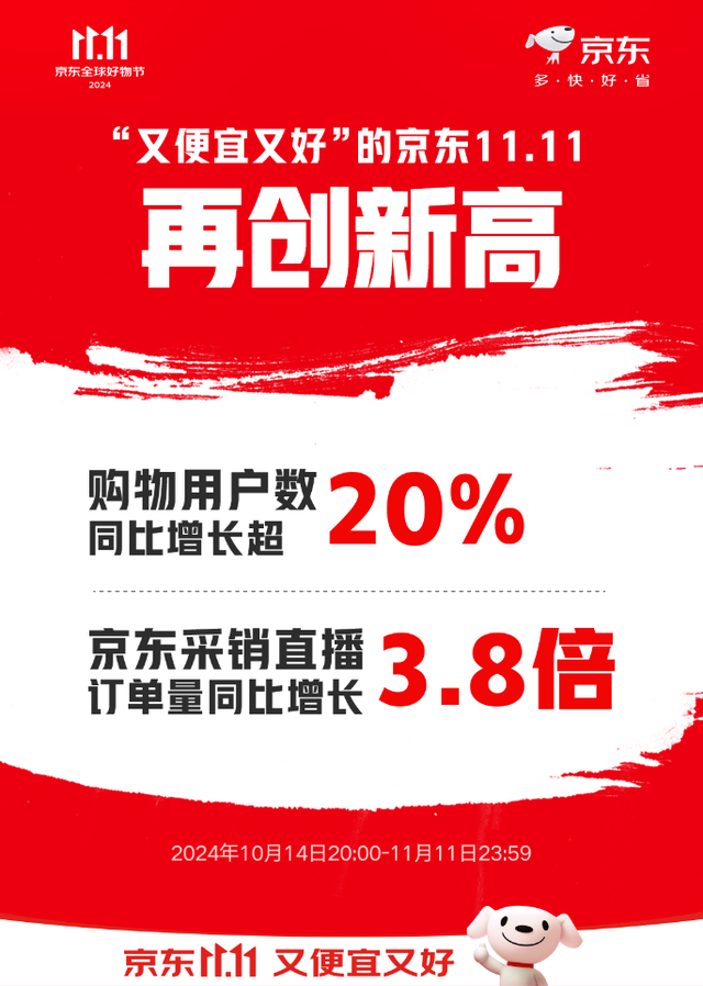 速途網11月12日訊(報道:喬志斌)截至11月11日23:59,2024年京東11.11購物用戶數同比增長超20%,京東采銷直播訂單量同比增長3.8倍。超17000個品牌成交額同比增長超5倍,超30000個中小商家成交額同比增長超2倍。