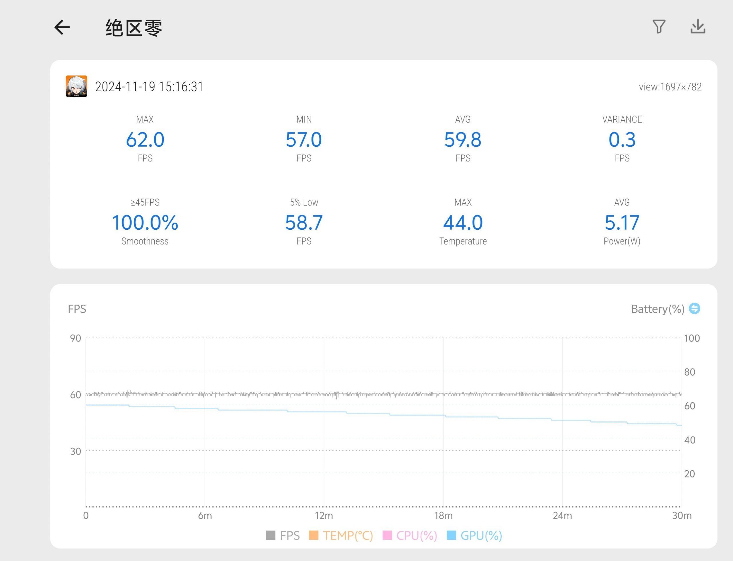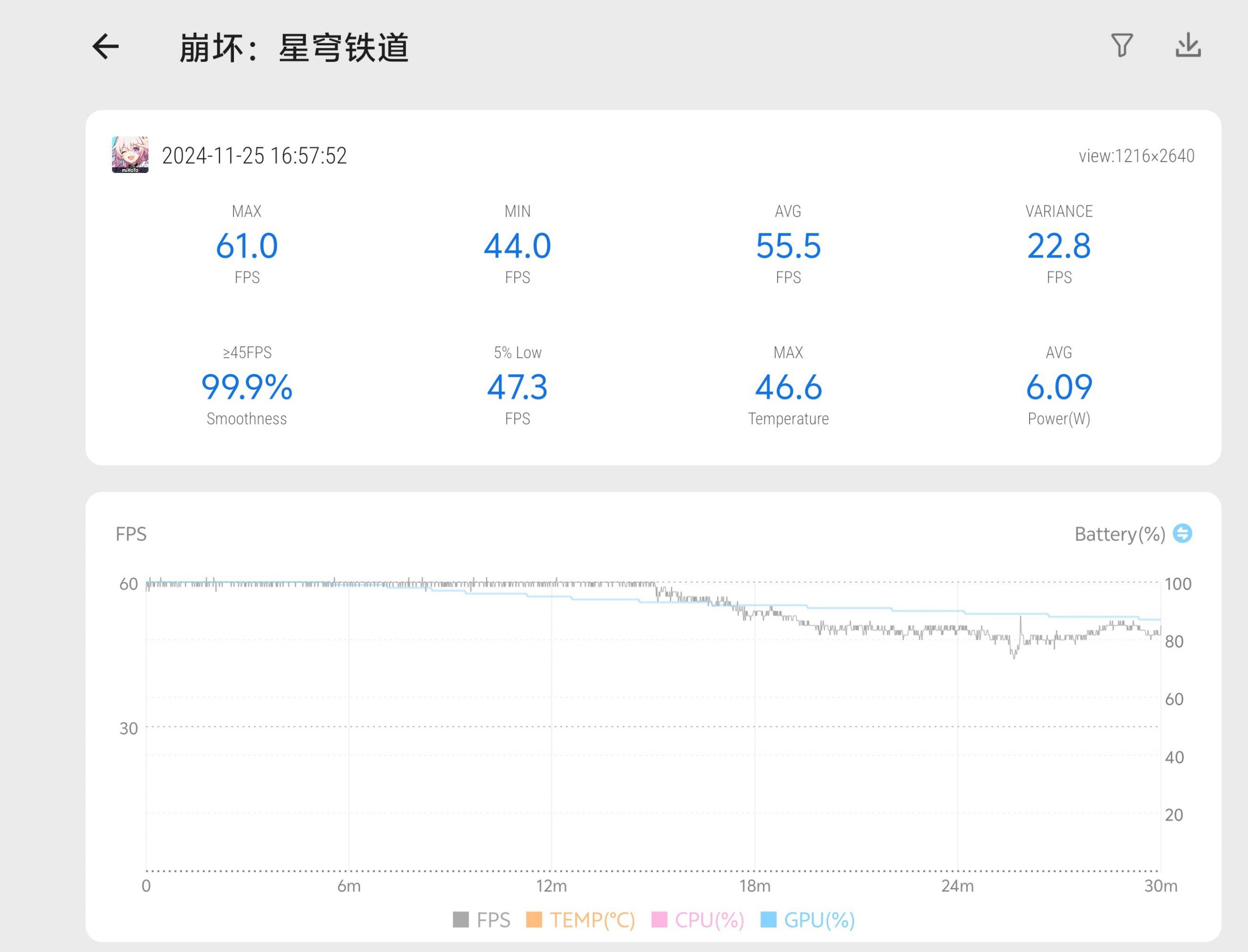 而在更高負載的《原神》測試環節,先將游戲內畫面設置調為“極高”,再手動將幀率調整到60FPS的模式,vivo X100 Pro在30分鐘的游戲過程中,平均幀率維持在了60.1FPS,且幀率全程表現穩定。