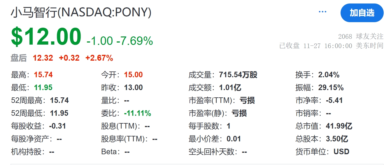 上市首日,小馬智行股價一度拉升至15.74美元/ADS,漲幅超21%,此后股價一路下跌,發(fā)行首日收盤價為12.00美元/ADS,跌破發(fā)行價,收跌7.69%。當(dāng)前小馬智行總市值為41.99億美元。