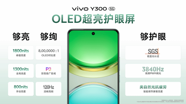 屏幕方面,Y300采用與Y300 Pro相同材質(zhì)的120Hz高亮OLED屏,高達(dá)800nits的手動最大亮度與1300nits的全局激發(fā)亮度,即使在戶外強(qiáng)光下也可看清屏幕內(nèi)容;還提供了全天候全方位護(hù)眼:3840Hz高頻PWM調(diào)光、類自然光抗疲勞等多項(xiàng)護(hù)眼技術(shù),更是通過了SGS低藍(lán)光認(rèn)證,為用戶帶來安全舒適的觀看體驗(yàn)。