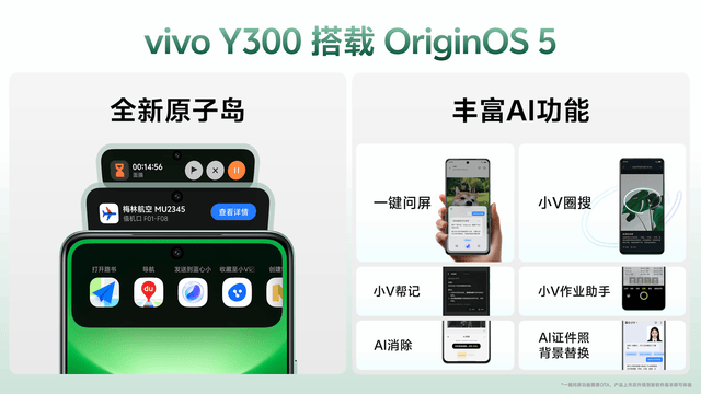 vivo Y300在Y系列產(chǎn)品中首發(fā)搭載OriginOS 5,新鮮“上島”。由原子通知全新進(jìn)化的“原子島”,以全新方式展現(xiàn)實(shí)時(shí)信息、系統(tǒng)狀態(tài)等,還可以復(fù)制、拖拽內(nèi)容,讓服務(wù)輕松直達(dá);領(lǐng)先的AI藍(lán)心大模型再進(jìn)化,小V圈搜、AI消除、小V幫記等智能助手貼心陪伴。備受好評的vivo首創(chuàng)職業(yè)模式也再次升級,無論是搶單助力還是三向定位增強(qiáng),都可以幫助特定職業(yè)用戶更方便地工作,成為他們的工作好幫手。