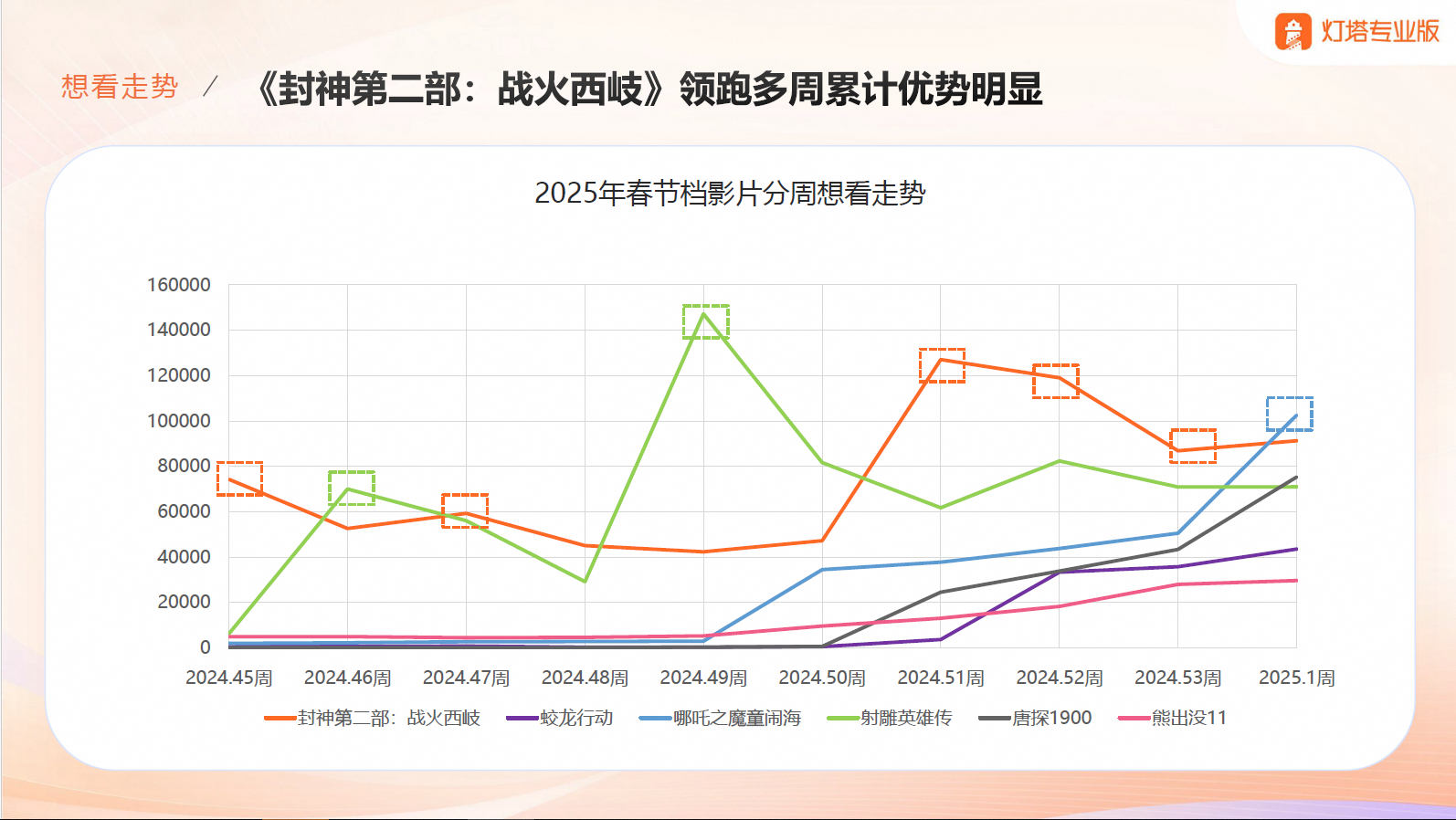 根據(jù)燈塔專業(yè)版實時宣發(fā)數(shù)據(jù),2025年春節(jié)檔影片映前90天至映前17天新增想看超218萬,創(chuàng)歷史同期新增想看新高,《封神第二部:戰(zhàn)火西岐》《射雕英雄傳·俠之大者》《哪吒之魔童鬧海》位列映前想看TOP3,《封神第二部:戰(zhàn)火西岐》和《射雕英雄傳·俠之大者》累計想看人數(shù)更是率先突破百萬。 合家歡屬性最強、受眾穩(wěn)定的“熊出沒”在歷年春節(jié)檔票房節(jié)節(jié)攀升,今年依舊有望繼續(xù)擔(dān)任檢驗頭部影片成色的“梯隊判官”。