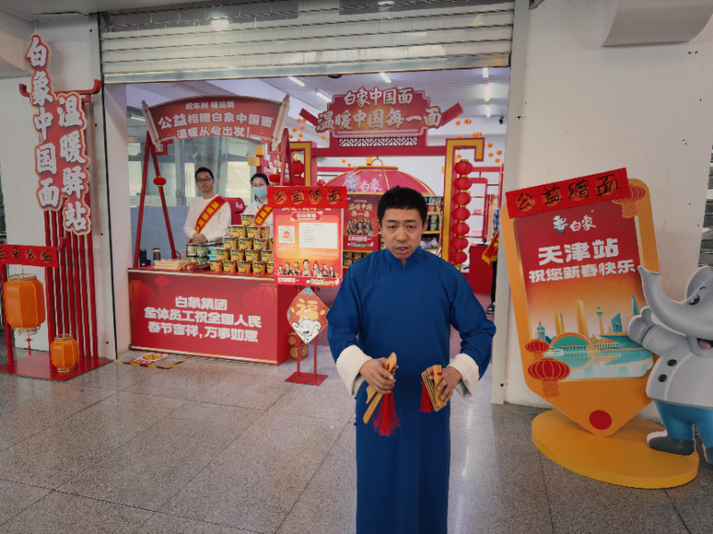 “打竹板,響連天,我給大家來拜年,一拜大家胃口好,吃嘛嘛香身體健……”朗朗上口的快板書配合極具辨識度的天津口音,為白象溫暖驛站又增添濃濃的“津味津韻”。