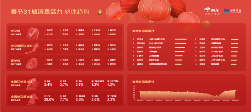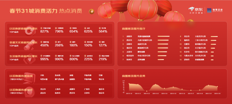 乙巳年春節(jié)假期,消費市場持續(xù)火熱,線下商圈通過特色場景化消費、生活娛樂消費以及文化體驗消費,吸引了大量消費者,展現(xiàn)了春節(jié)消費的多樣性與活力。京東聯(lián)合聯(lián)通數(shù)智智慧足跡,對全國31個城市的線下商圈客流量及消費數(shù)據(jù)進行了實時動態(tài)統(tǒng)計,反映出消費者在春節(jié)線上線下各場景中的消費趨勢。