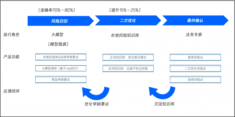 首先,借助DeepSeek,增強合同的風險初篩能力;其次,小悅智法通過正反向知識庫的二次優化,基于沉淀的知識庫優化風險問題,將綜合準確率提升至90%以上;最后,通過法務專家校準與使用數據反饋,小悅智法將基于數據反饋實現自我進化,越用越聰明,合同審核的精準度也將實現再度進化。