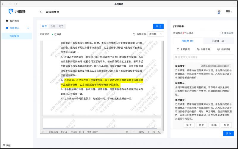 傳統的合同審核流程,往往依賴于人工逐句審查,不僅耗時耗力,而且難以應對日益增長的合同量和日益復雜的合同內容。在這樣的背景下,小悅智法應運而生。小悅智法基于大模型的能力,結合本地知識庫二次優化,構建專業的智能審核應用,讓合同審核效率倍增。