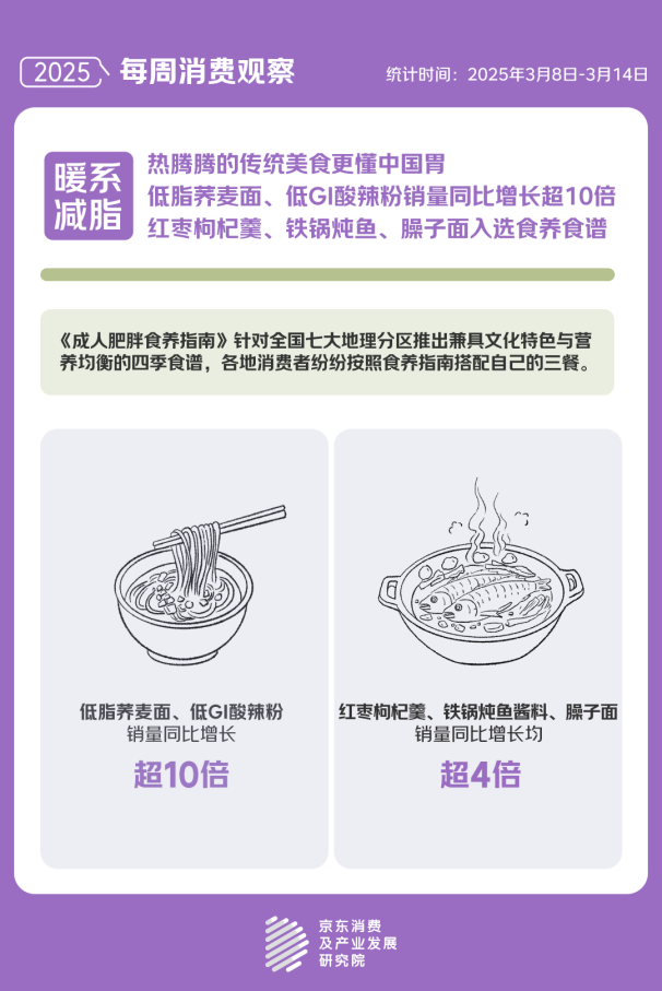 營養學家指出,這種“本土化飲食改造”既有營養學上的科學依據,又充分考慮了中國人的口味和飲食習慣,更容易被大眾接受和長期堅持。有陜西網友留言:“終于不用含淚啃草,臊子面也能吃出小蠻腰!”近一周,低脂蕎麥面、低GI酸辣粉的銷量同比增長超10倍,紅棗枸杞羹、鐵鍋燉魚醬料、臊子面的銷量同比增長均超4倍。