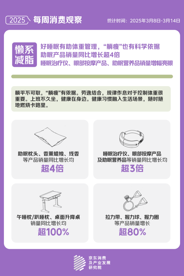 規律作息對于體重管理十分重要。《指南》中強調,經常熬夜、睡眠不足、作息無規律可引起內分泌紊亂,脂肪代謝異常,增加肥胖風險。“聽勸”的網友紛紛下單購買各類助眠產品,助眠枕頭、香薰蠟燭、線香等產品銷量同比增長均超4倍,睡眠治療儀、眼部按摩產品及助眠營養品等銷量同比增長均超3倍。職場人士買走了更多的午睡枕/趴睡枕,銷量同比增長超100%。