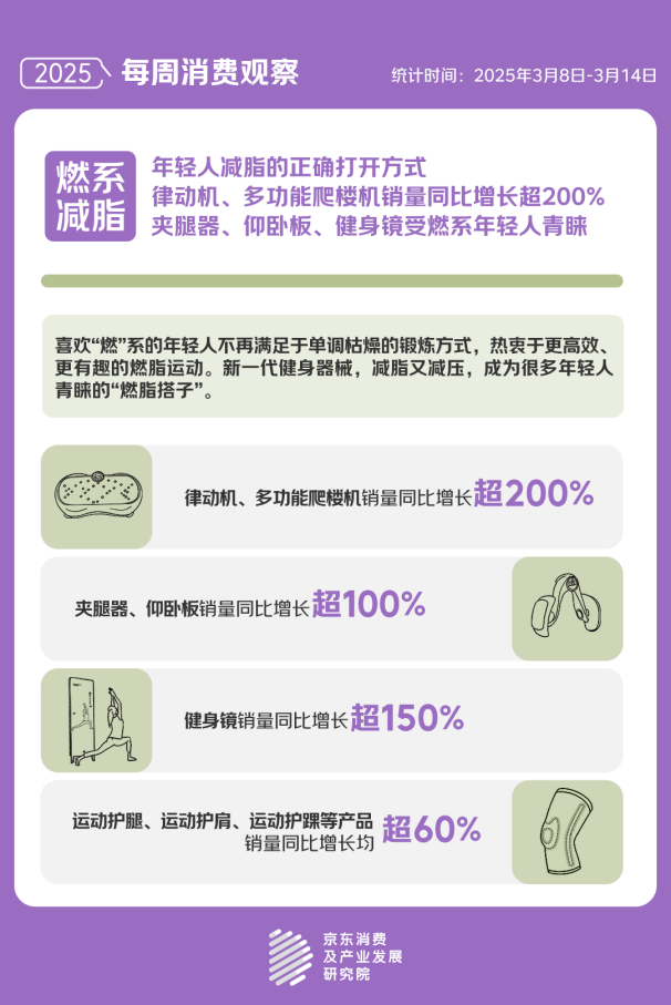 喜歡“燃”系的年輕人不再滿足于單調枯燥的鍛煉方式,熱衷于更高效、更有趣的燃脂運動。新一代健身器械,減脂又減壓,成為很多年輕人青睞的“燃脂搭子”。過去一周,律動機及多功能爬樓機的銷量同比增長超200%,鍛煉身體局部的裝備如夾腿器(腿部)、仰臥板(腰腹)的銷量同比增長超100%,健身鏡的銷量同比增長也超150%。同時運動防護裝備也熱銷,如運動護腿、運動護肩、運動護踝等產品銷量同比增長均超60%。在選購“夾腿器”時,消費者會更加關注與腿部的貼合度、升級計數功能以及降噪靜音。