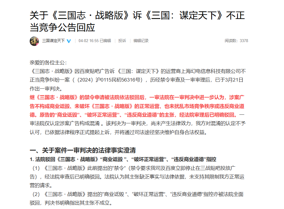 B站則在《三國:謀定天下》的官方微博反擊稱,繼《三國志?戰略版》的禁令申請被法院依法駁回后,一審法院在一審判決中進一步認為,涉案廣告不構成商業詆毀、未破壞《三國志?戰略版》的正常運營、也未擾亂市場競爭秩序或違反商業道德。原告的“商業詆毀”、“破壞正常運營”、“違反商業道德”的主張,經法院審理后已明確駁回。