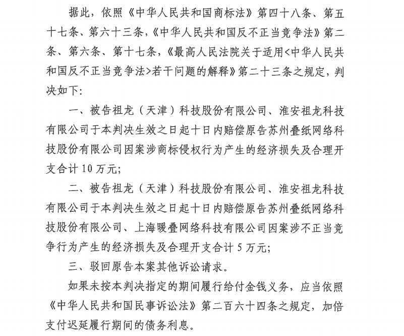 法院判決,祖龍向疊紙賠償因案涉商標侵權行為產生的經濟損失及合理開支共合計10萬元。及因案涉不正當競爭行為產生的經濟損失及合理開支合計5萬元。