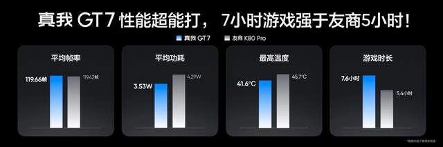 為充分發揮3nm旗艦芯的潛能,真我GT7升級全新GT性能引擎2.0,首發芯片級內核技術,每幀畫面渲染負載至高降低30%,有效提升游戲能效與溫控表現。《王者榮耀》120fps+極致畫質,滿電玩到關機超過7個小時,幀率、能效、溫控均比其它3nm性能旗艦5小時的表現更出色。