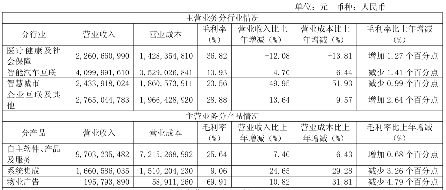主營業務分行業來看,2024年,東軟集團的醫療健康及社會保障業務實現營業收入22.61億元,同比減少12.08%,毛利率同比增加1.27個百分點;智能汽車互聯業務的營收為41億元,同比增長4.7%,毛利率同比減少1.41個百分點;智慧城市業務營收為24.34億元,同比大增49.95%,毛利率同比減少0.99個百分點;企業互聯及其他業務的收入為27.65億元,同比增長13.64%,毛利率同比增加2.64個百分點。