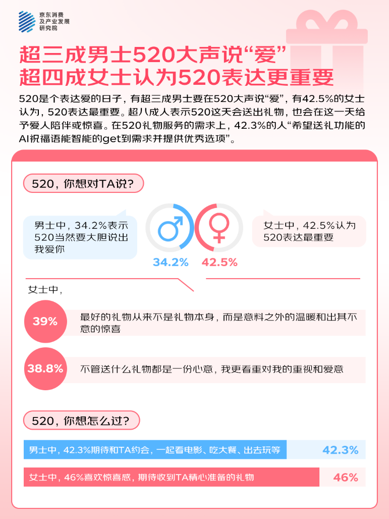 -今年520,有超三成男士要大聲說“愛”,有42.5%的女士認為,520表達最重要。超八成人表示520這天會送出禮物,也會在這一天給予愛人陪伴或驚喜。