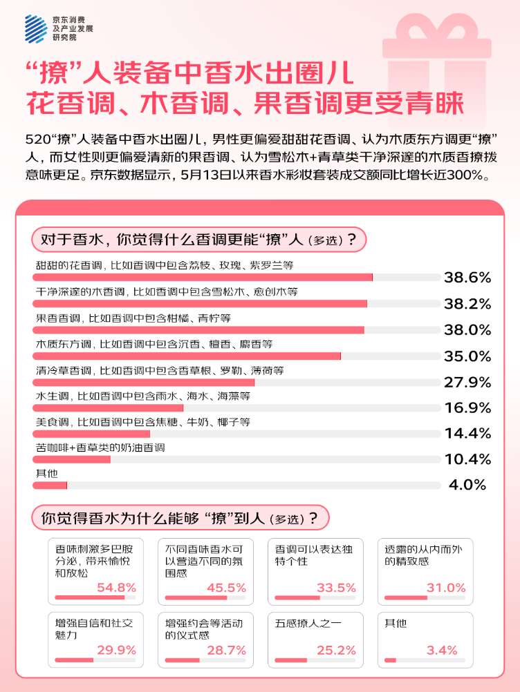 520“撩”人裝備中,香水成為熱門禮物選項之一。香水作為“無形的時尚單品”,通過氣味傳遞情感記憶,被賦予“撩人指數”提升、個性表達等功能。在對“撩”人香型的選擇上,男性與女性存在一定的感知差異。男性更偏愛甜甜花香調、認為木質東方調更“撩”人,而女性則更偏愛請新的果香調、認為雪松木+青草類干凈深邃的木質香撩撥意味更足。