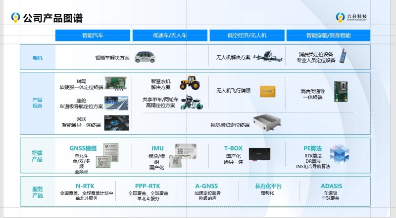 六分科技專注于提供高精度定位產品服務,完美適配北斗衛星導航定位系統,并兼容GPS、伽利略、格洛納斯系統,具備軟硬一體化的全球定位服務能力,自研高精度定位GNSS模組、IMU模塊/模組、通導一體T-BOX等終端硬件產品,向用戶提供輔助駕駛軟硬服一體定位終端、座艙車道級導航定位方案、網聯智能通導一體終端等產品組合,針對不同行業用戶終端的特點適配RTK和組合導航算法,充分滿足輔助駕駛、智能手機、無人機、共享單車、智能機器人、可穿戴設備等場景下的高精度定位需求,以軟硬一體化、高性價比、可定制化等優勢贏得眾多用戶青睞。