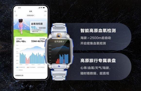 針對高原旅行場景,Z11推出了智能高原血氧監測,能夠在海拔高于2500米時,自動開啟密集血氧監測;孩子也可通過專屬的高原表盤,隨時看到心率、海拔、血氧等健康數據。