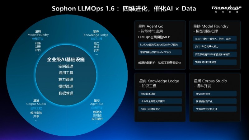 星環科技在此次發布會上重點介紹了Sophon LLMOps 1.6平臺的四維進化,作為企業級AI基礎設施,Sophon LLMOps統一支撐空間管理、模型、算力管理、數據管理、通用工具,實現智能體驅動的AI全流程運營,實現了從數據到智能、從模型到應用的閉環升級,全面催化 AI × Data 的深度融合。