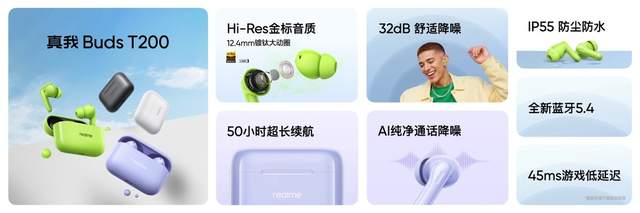 此次發(fā)布會還帶來了真我TWS新品——真我Buds T200。作為百元級市場的“越級”之作,真我Buds T200搭載12.4mm鍍鈦大動圈,錄音室級超高清音質(zhì)通過了Hi-Res小金標(biāo)認(rèn)證,并升級支持32dB靜謐降噪,提供50小時超長續(xù)航。全新的金屬質(zhì)感工藝,帶來高端視覺和觸覺體驗。真我Buds T200起售價129元,今天正式開售。