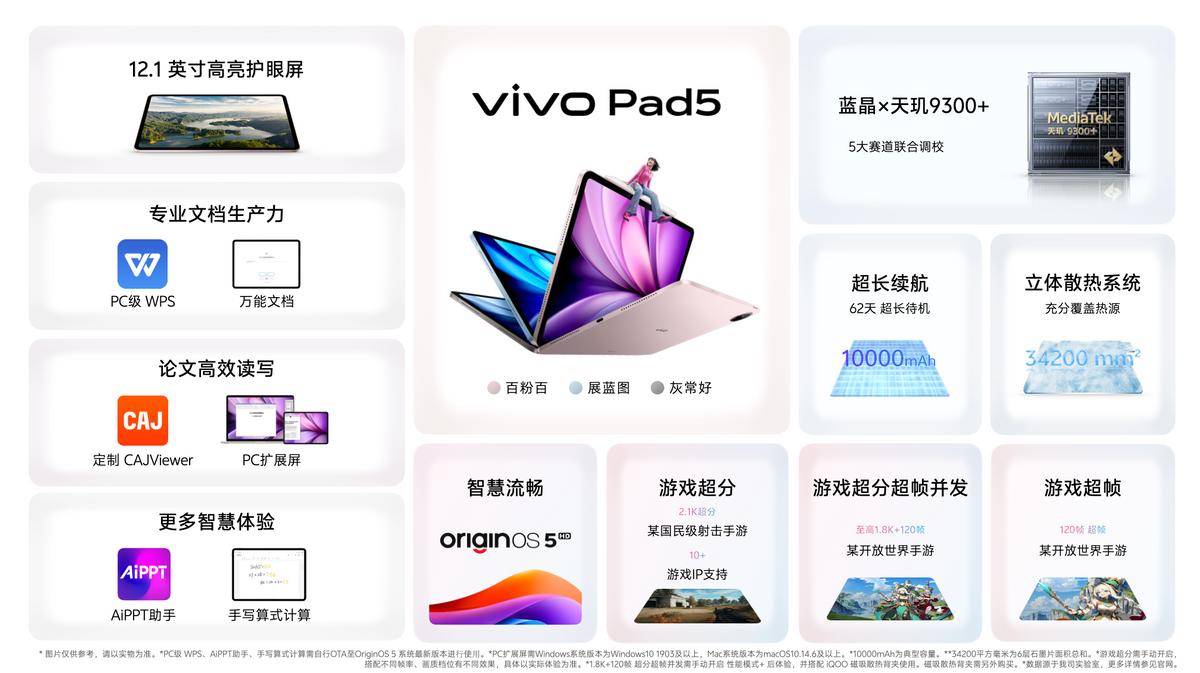 除了vivo S30系列,發布會還有多款全新vivo IoT產品攜手亮相。vivo Pad5搭載藍晶 × 天璣 9300+,一體化輕薄金屬機身僅重590g,卻擁有10000mAh超長續航和立體散熱結構,并以行業領先的超分超幀能力為用戶帶來優質體驗;搭載12.1英寸高亮護眼屏和自研6揚全景聲學系統,構筑至臻視聽享受;得益于OriginOS 5 HD帶來的專業文檔生產力和系統級藍心大模型AI,配合智能配件三件套,助你學習或辦公都事半功倍。vivo Pad5上市價格2499元起,疊加預售和國補優惠,僅需2039.15元起,現已開啟預售,并將于6月6日正式開售。首銷期購買,還有更多優惠可享。