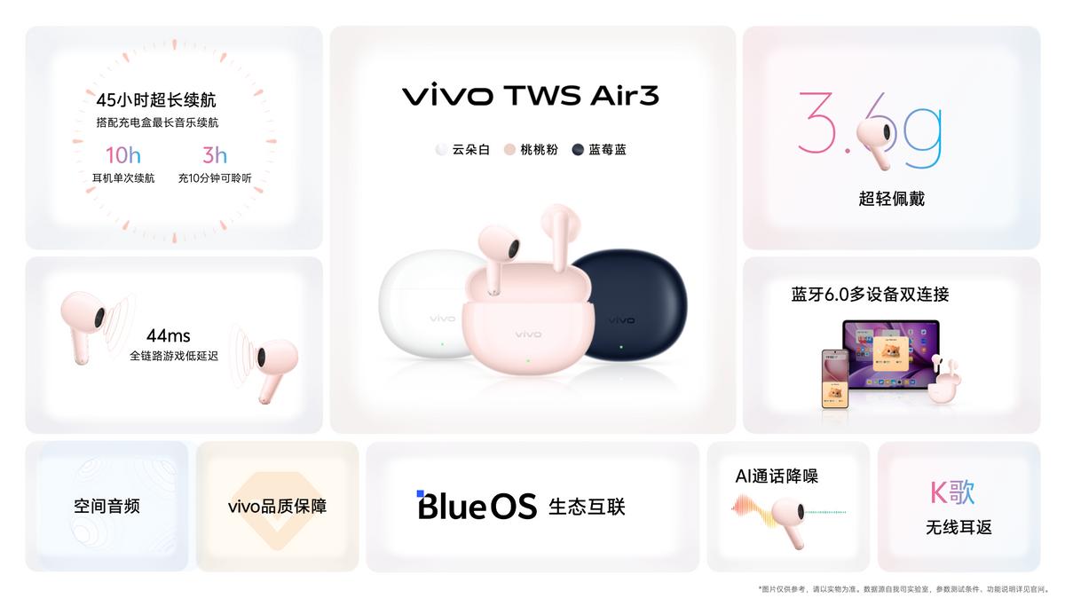 vivo TWS Air3現已開售,上市價格99元,單耳機僅重3.6g,支持IP54防塵抗水、至長45小時聽歌續航(配合耳機盒)、44ms全鏈路游戲低時延和藍牙6.0多設備雙連接,融入BlueOS生態,是vivo生態的極佳拍檔。