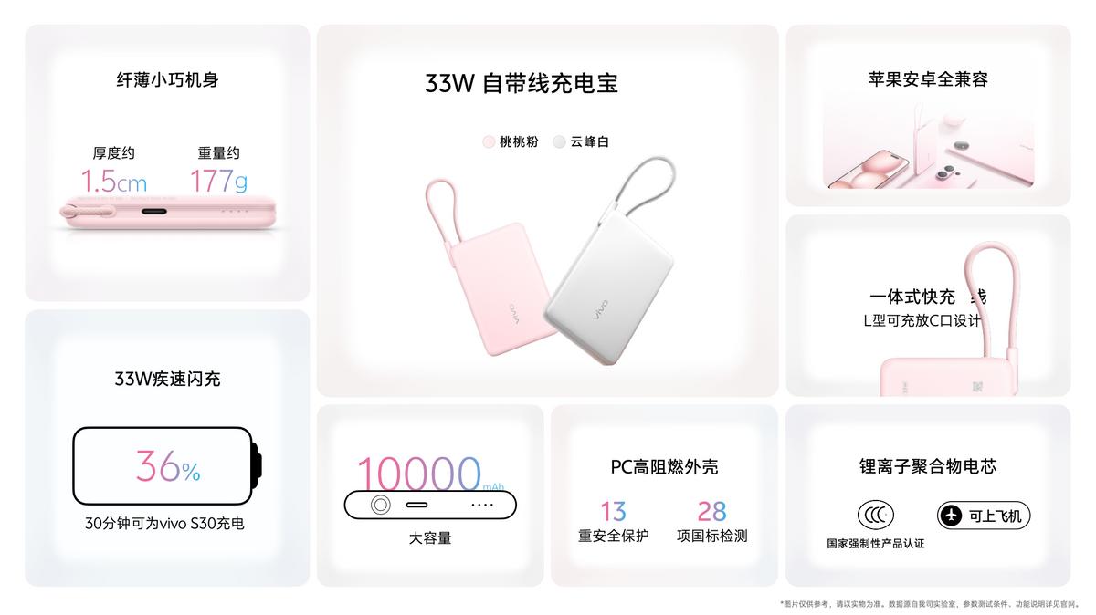 vivo 10000mAh 33W 自帶線充電寶同期發布,上市價格129元,6月6日正式開售,6月18日前搭配S30系列手機組合購買僅需89元。vivo IoT產品更有全新推出的教育優惠,買平板送手寫筆,手表、耳機、配件補上加補至高立減20%。