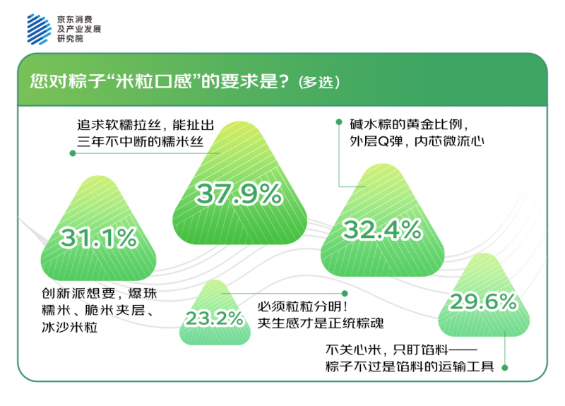 一位在調(diào)研中傾向選擇自己包粽子的消費(fèi)者認(rèn)為,粽子米的選擇非常重要,選對了米包出來的粽子才能軟糯適口不粘牙。七分糯米三分粳米是粽子的黃金比例,圓潤飽滿的糯米搭配當(dāng)季新粳米。在對米粒口感的追求上,調(diào)研顯示,37.9%的消費(fèi)者依然鐘情于“軟糯拉絲”的經(jīng)典口感,但同時也有32.4%的人偏愛堿水粽那種外層Q彈,內(nèi)芯流心的獨(dú)特口感,還有31.1%的人屬于口感創(chuàng)新派,想要嘗試“爆珠糯米+脆米夾層+冰沙米粒”的多重口感。23.2%的受訪者比較特立獨(dú)行,認(rèn)為顆粒分明的夾生感才是“正統(tǒng)粽魂”。