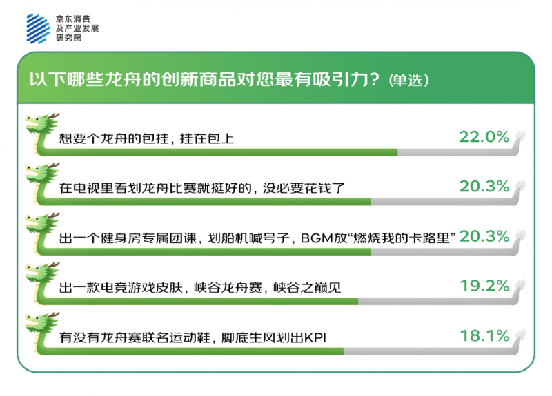 在傳統(tǒng)文化復(fù)興熱潮下,龍舟作為端午熱門IP之一,成為深受年輕人喜愛的文創(chuàng)新icon,開發(fā)出多種“周邊衍生品”。在帶有龍舟元素的創(chuàng)新產(chǎn)品中,選擇龍舟包掛件的比例最高,有受訪者調(diào)侃表示,戴個龍舟造型的包掛件,“仿佛上班劃水摸魚都更有底氣了”。還有受訪消費(fèi)者希望買到龍舟聯(lián)名運(yùn)動鞋,認(rèn)為是“傳統(tǒng)文化與現(xiàn)代運(yùn)動潮流的完美結(jié)合”。更有消費(fèi)者希望游戲廠商推出“龍舟皮膚”,在線上來一場“賽博龍舟賽”。