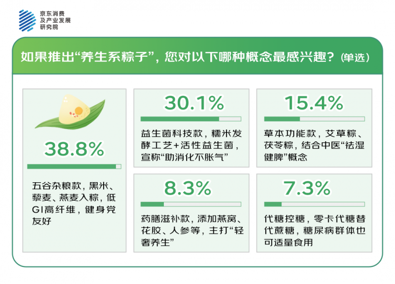 此外,“朋克養(yǎng)生風(fēng)”吹到了粽子界,調(diào)研顯示,在創(chuàng)新粽子中選擇“功能養(yǎng)生款”的消費(fèi)者比例最高,其中低GI高纖維的五谷雜糧款粽子和主打“助消化不脹氣”的益生菌元素款粽子等更受消費(fèi)者青睞。京東超市消費(fèi)趨勢顯示,養(yǎng)生類粽子銷量農(nóng)歷同比增長達(dá)177%,藥食同源、燕窩、雜糧等健康食材成為養(yǎng)生粽的“三大頂流”。