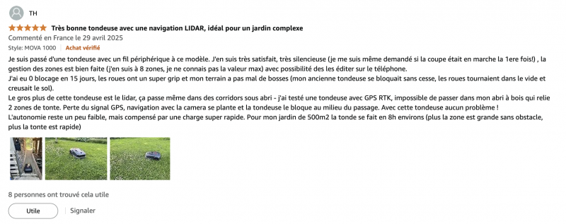 法國用戶TH在評論區留言:“我從一款需要邊界線的割草機器人換用了這個型號(MOVA 1000),對此非常滿意。這臺機器非常安靜(安靜到我第一次使用時還以為沒有啟動割草功能!)。分區管理做得很好(我設置了8個區域,不清楚最大值是多少),還能在手機上進行調整 ……這款割草機最大優勢是配備了LIDAR激光雷達,就算是在有頂棚的通道內也能順利通過——我曾用RTK GPS的割草機測試,根本無法通過連接兩個割草區域的木棚通道。GPS信號丟失、攝像頭導航失敗都會導致機器人卡在通道中間。但這臺機器完全沒有這些問題!”