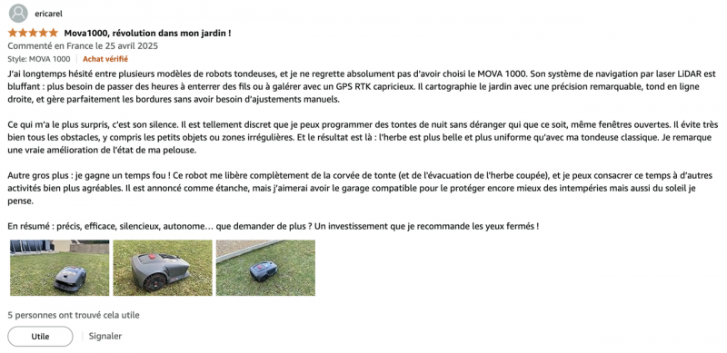 來自法國的用戶ericarel在亞馬遜留言:“我在幾種型號的機器人割草機之間猶豫了很久,我不后悔選擇了 MOVA 1000。它的 LiDAR 激光導航系統非常棒:不再需要花費數小時埋線或與反復無常的 RTK GPS 糾纏不清。它能夠以驚人的精度繪制花園地圖,以直線修剪草坪,并完美處理邊緣,無需手動調整……這個機器人讓我完全擺脫了割草(和處理割下的草)的苦差事,我可以將這段時間投入到其他更有趣的活動中。”
